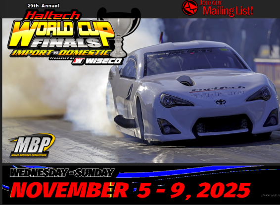 November 05 – 09 Wednesday – Sunday 29th Annual Haltech World Cup Finals Import Vs. Domestic Maryland International Raceway The 29th annual Haltech World Cup Finals Import vs. Domestic presented by Wiseco will take place at Maryland International Raceway on November 5-9, 2025. The event features Import vs. Domestic Drag Racing, IBT Bikini Contest, a Huge Vendor Midway, and a Live DJ! The event is busting at the seams… Nov 05 – 09 29th Annual Haltech World Cup Finals Import Vs. Domestic Maryland International Raceway Purchase Tickets Pricing Information Spectators and Crew $40.00 1 Day $130.00 4-Day Pass $50.00 Pit Pass $250.00 VIP Suite Racer $100.00 Class 1 $150.00 No Box $50.00 Test & Tune Important Times 2025 Schedule Event schedule is subject to change Tuesday Gates Open 11am Parking11am-6pm Gates Close 6pm Wednesday Gates Open 8am Parking 8am-9pm Tech Inspection 9am-7pm Testing ($300 per car) 12pm-7pm Gates Close 9pm Thursday Gates Open 8am Parking 8am-9pm Tech Inspection 9am-7pm Qualifier #1 (AM, XFWD, OE, RM, PS, XH, WT, SF, STK, WS, LS, DCT)12pm-5pm Gates Close 9pm Friday Gates Open 8am Qualifier #2 (AM, XFWD, OE, RM, PS, XH, WT, SF, STK, WS, LS, DCT) 10am-3pm Qualifier #3 (OE, RM, PS, XH, WT, SF, STK, WS, LS, DCT, AM, XFWD) 3pm-8pm Costume Contests (Youth & Adults) 7pm Trick or Treat in Camper Village 8pm Gates Close 9pm Saturday Gates Open 8am Qualifier #4 (AM, XFWD, OE, RM, PS, XH, WT, SF, STK, WS, LS, DCT) 10am-3pm Qualifier #5 (OE, RM, PS, XH, SF, STK, DCT, XFWD) 3pm-6pm Eliminations 32-Cars (WT, WS, LS, AM) 6pm-8pm Gates Close 9pm Sunday Gates Open 8am Eliminations 16-Cars (AM, XFWD, OE, RM, XH, WT, SF, STK, WS, LS, DCT) 10am Live DJ on Stage 11am-4pm Eliminations 8-Cars (OE, RM, PS, XH, WT, SF, STK, WS, AM, LS, DCT, XFWD) 2pm Bikini Contest 3pm Eliminations 4-Cars (OE, RM, PS, XH, WT, SF, STK, WS, AM, LS, DCT, XFWD)4pm Eliminations Finals (OE, RM, PS, XH, WT, SF, STK, WS, AM, LS, DCT, XFWD)6pm Location Maryland International Raceway 27861 Budds Creek Rd Mechanicsville MD 20659 The 29th annual Haltech World Cup Finals Import vs. Domestic presented by Wiseco will take place at Maryland International Raceway on November 5-9, 2025. The event features Import vs. Domestic Drag Racing, IBT Bikini Contest, a Huge Vendor Midway, and a Live DJ! The event is busting at the seams with over 50,000 fans in attendance, and there is no other event like it on the planet! The WCF event breaks more class records than any event on Earth due to Jason Miller's legendary track prep team and unparalleled cool and dry atmospheric conditions that only exist this time of year! Racers come to this event to obliterate records and make history! The event draws 300 Heads-Up racers from over 10 different countries competing for over $275,000 in cash purse & awards in twelve different classes of competition: Mickey Thompson Tires - Outlaw vs Extreme Atomizer Fuel Systems - Renegade vs Modified Precision Turbo & Engine - X295 vs Hot Rod Competition Clutch - Warriors vs Tres Cuarto Next Gen Performance - Street Fighter Grannas Racing - Stick Shift Faster Motorsports - Wild Street MRacing - DCT Turbosmart - Limited Street Real Street Performance - XFWD 4 Piston Racing - All Motor Platinum General Services - Pro Street Bike The event brings you side by side racing action from just about every type of genre in drag racing featuring the top cars from just about every sanctioning body in the country! Forget the trash talking, it's time to prove that these drivers have got what it takes, with each side putting their reputation and egos on the line! The International Bikini Team kicks off the Bikini Contest on Sunday and is always a crowd favorite at WCF! Also, be sure to check out over 2,300' of vendors on the vendor midway where you'll find performance parts, accessories, and apparel at great prices! Also, please make note that spectators are not permitted to bring Golf Carts, ATVs or other Pit Bikes to WCF. Also, no smoking or vaping is allowed in the bleachers. These rules are strictly enforced. In addition, anyone coming Tuesday, Wednesday or Thursday must purchase in advance a Full Event Pass or a VIP Pass. So be sure to mark your calendars for the 29th annual Haltech World Cup Finals Import vs. Domestic presented by Wiseco at Maryland International Raceway on November 5-9, 2025 for the best show in drag racing! info from https://importvsdomestic.com/ Racer Information Spectators and Crew Information Goes on sale Aug 25 Drag Racing Participant $300 2025 Ticket Prices Buy Tickets in Advance before we sell out again! Kids 11 & under are FREE! Must purchase a Full Event or VIP pass to attend Tues, Wed or Thurs! VIP Tickets VIP Reserved Section (Tues-Sun) Goes On Sale Sept. 1 $135 BEST SEATS IN THE HOUSE! This section will be limited to only 1,900 spectators and crew in 2025. The VIP reserved section is the elevated bleachers next to the tower on the pit side. This ticket will include admission from Tuesday through Sunday. Everyone in the VIP section must purchase a VIP ticket - this includes children (regardless of child's age) because they are taking a seat from a limited quantity available. We will have ushers in place on Friday-Sunday that will only allow people with VIP armbands in this section. This way, you will always have a seat waiting for you if you decide to get some food, go to the restroom, check out the vendor midway, and see your favorite teams in the pits. All coolers must be no bigger than 14 inches and must fit between your feet. General Admission Full Event Pass (Tues-Sun) Goes On Sale Sept. 1 $100 2-Day Pass (Fri-Sat) Goes On Sale Sept. 1 $75 2-Day Pass (Sat-Sun) Goes On Sale Sept. 1 $75 1-Day Pass (Fri) Goes On Sale Sept. 1 $40 1-Day Pass (Sat) Goes On Sale Sept. 1 $40 1-Day Pass (Sun) Goes On Sale Sept. 1 $40 Parking General Spectator Parking Free Pit Side Grass Parking Lot Goes On Sale Sept. 1 $75 This parking lot is located on the right side of the pit area in the grass lot, and 